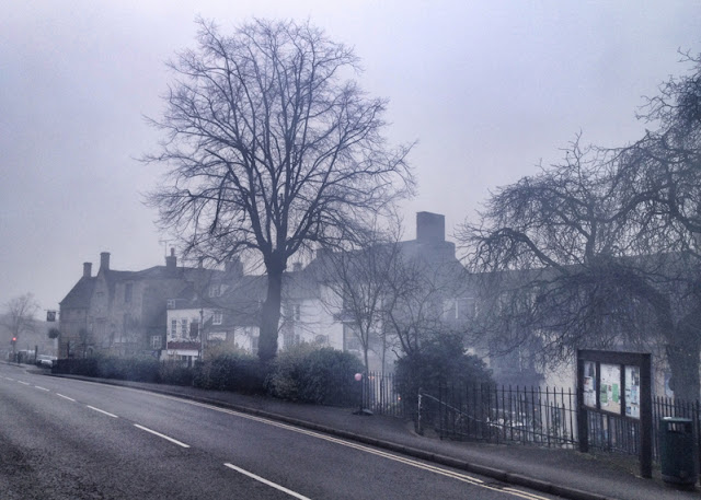 Scenes that were picture-perfect in clear sunlight, now turned grey and mysterious. Chipping Norton High Street (above) mixed smoke and mist in roughly equal quantities for the rather sulphurous effect you can see above. Below, the Town Hall was just a shadowy presence at the far end.