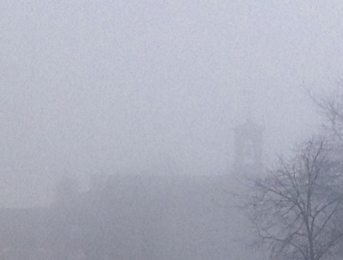 Scenes that were picture-perfect in clear sunlight, now turned grey and mysterious. Chipping Norton High Street (above) mixed smoke and mist in roughly equal quantities for the rather sulphurous effect you can see above. Below, the Town Hall was just a shadowy presence at the far end.