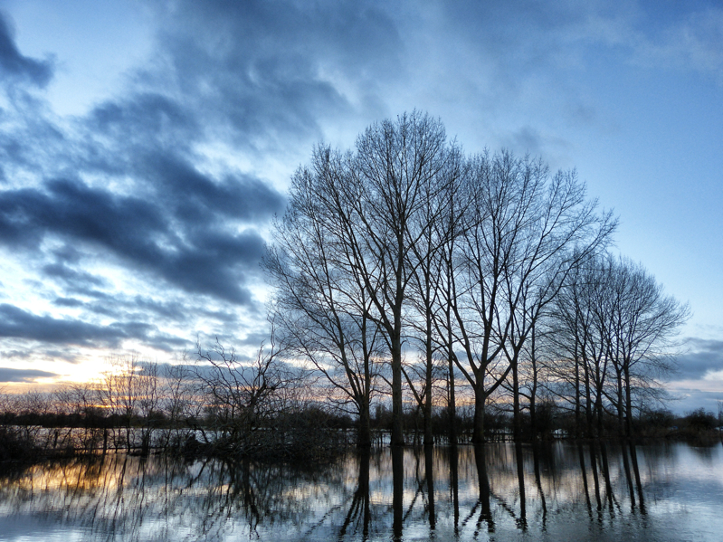 At Lechlade, the River Thames had overflowed into fields south of the town, turning green pastures into an inland ocean. I stopped on the way back from a bracing walk around White Horse Hill to take these pictures, and very impressive the waters were too, revealing a road that was little more than a raised causeway between liquid panoramas on either side.