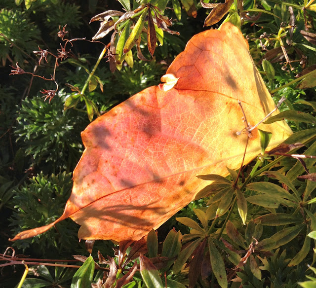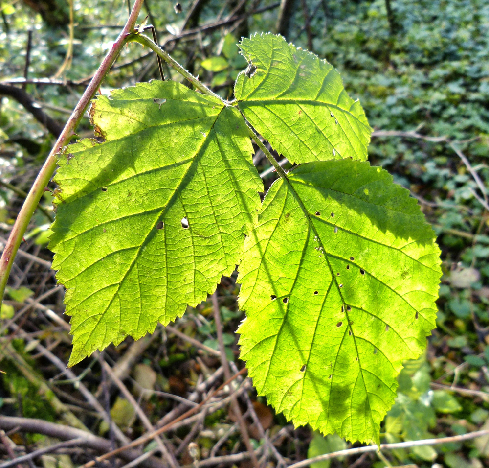 Protected from frost by the dense woodland cover adjacent to the bridleway, a trio of leaves cling on to their summer green. Not for much longer…