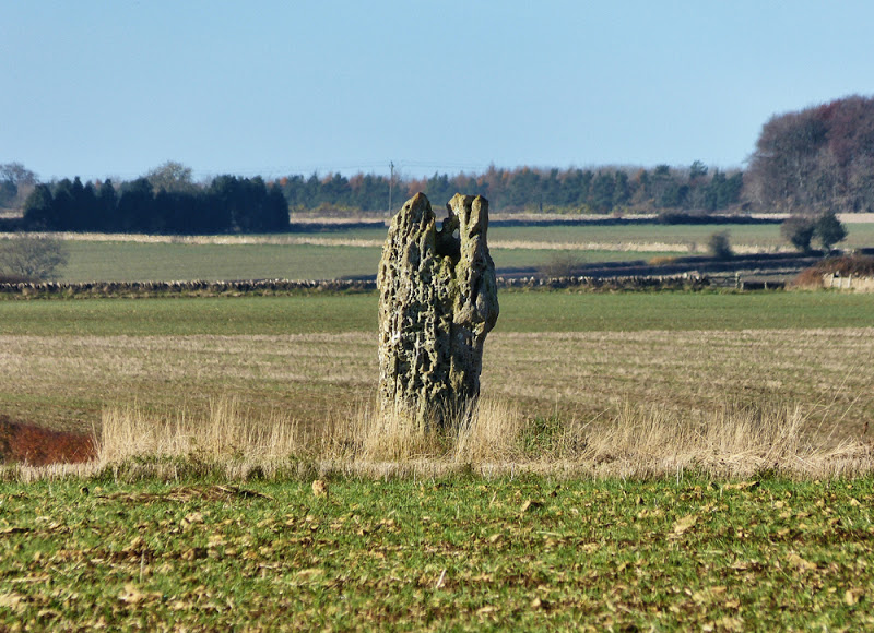 My Ordnance Survey map showed the Hawk Stone to be off an adjacent country lane, perhaps in a field or next to a public footpath, and that’s where it proved to be, standing alone, an upright chunk of limestone some 7-8 feet high.